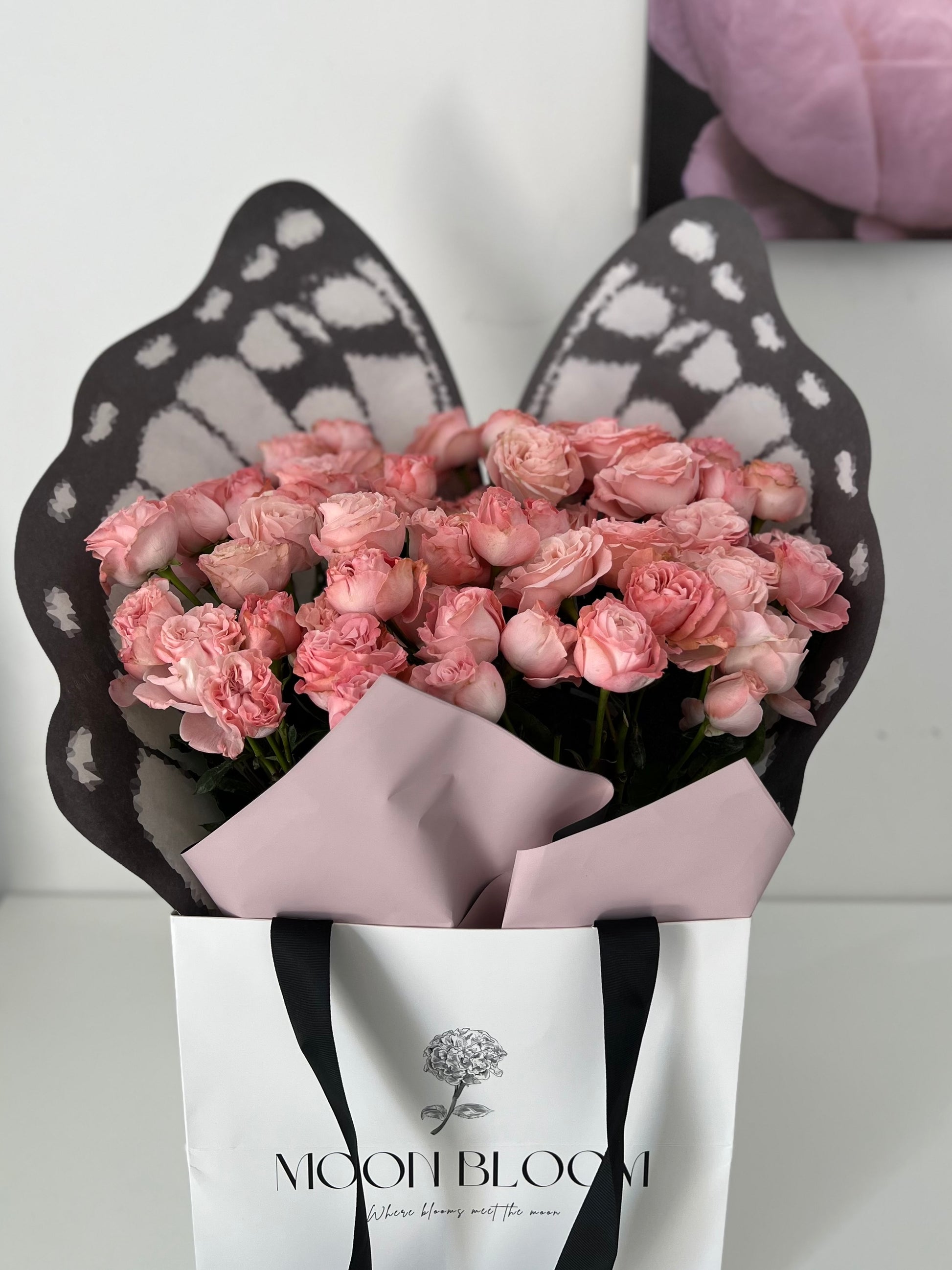 A graceful cluster of soft pink blooms wrapped in delicate wings, dreamy and romantic. Available in different sizes.