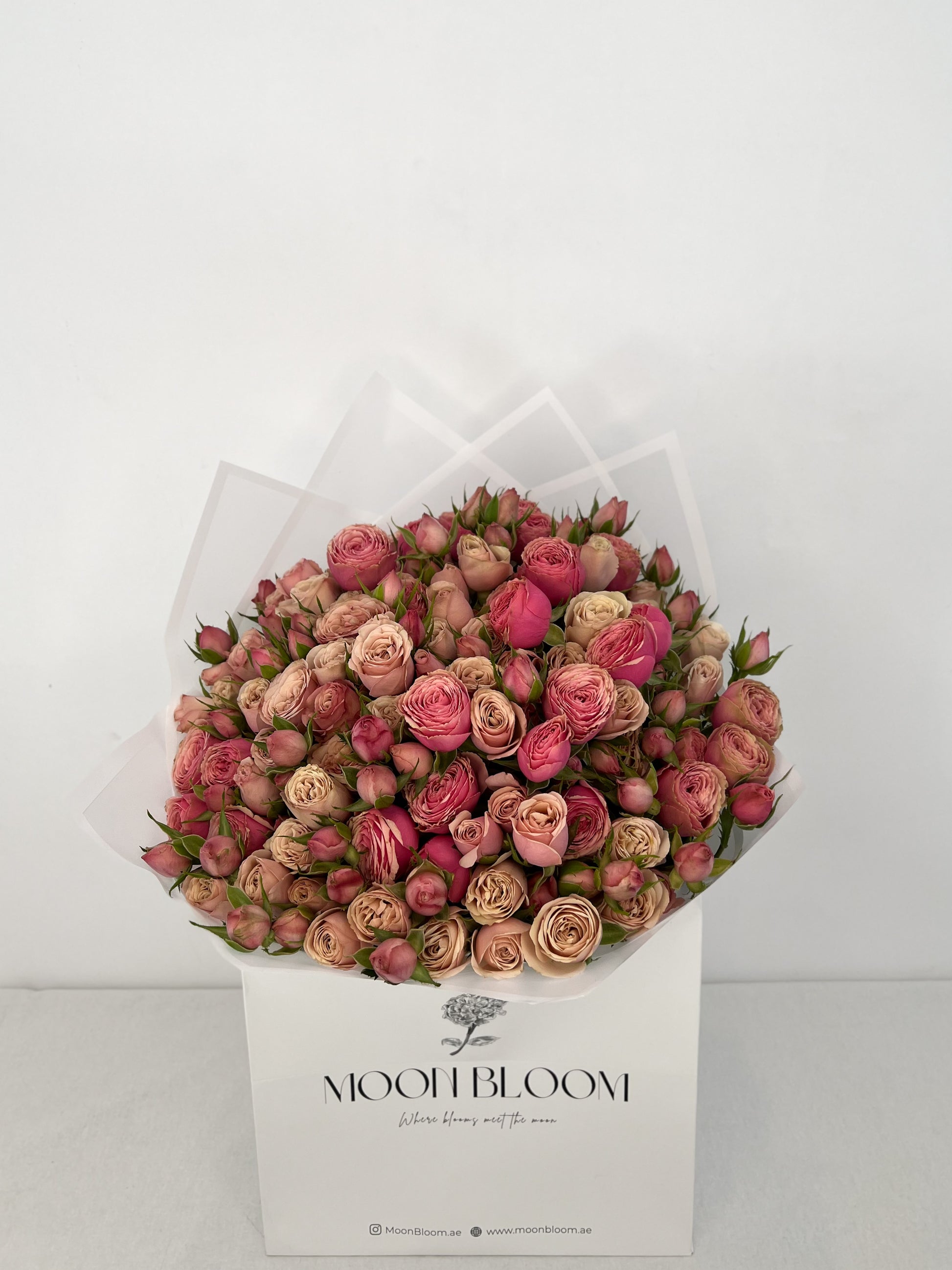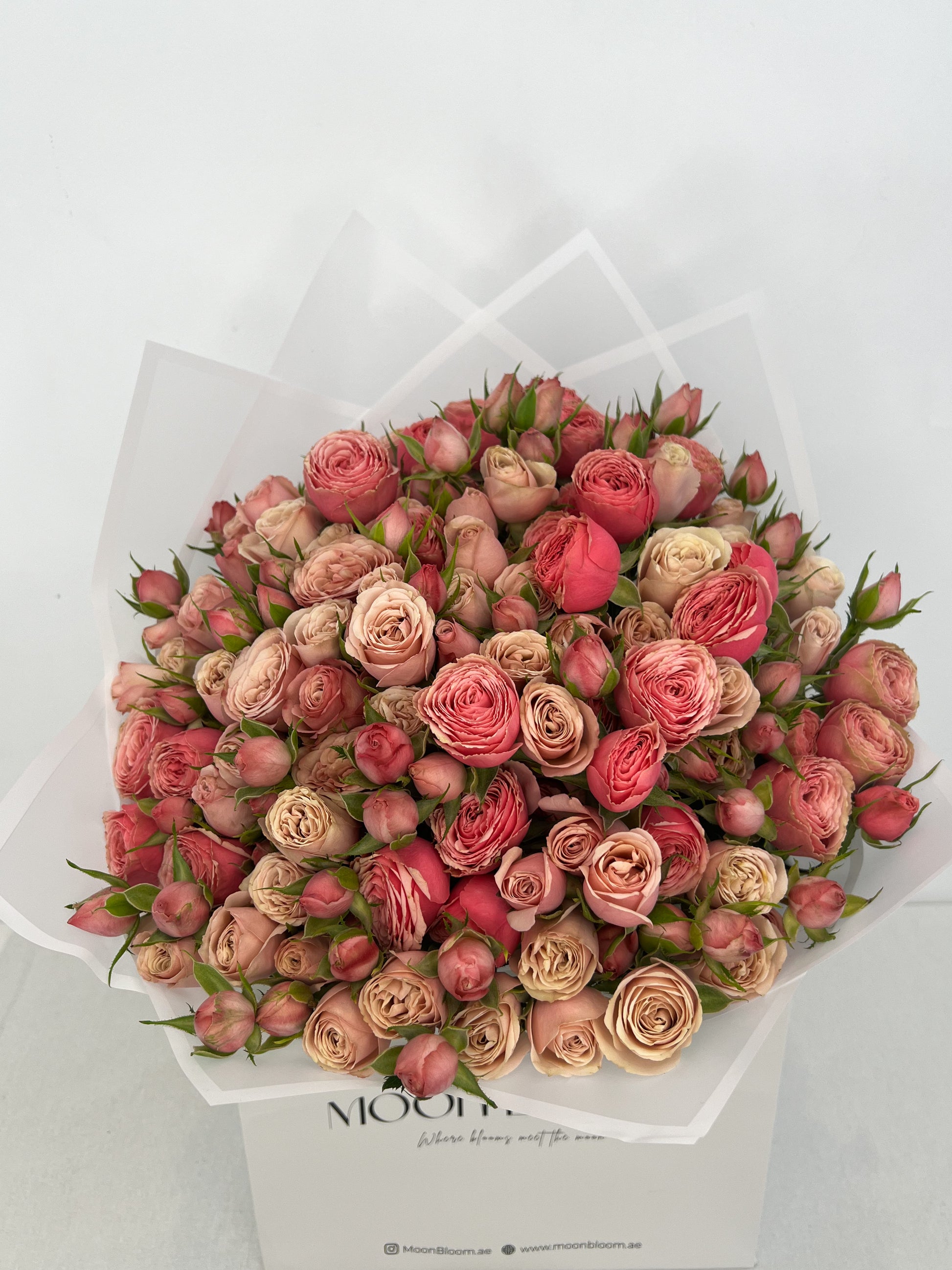 A charming blend of pink roses, soft and sweet, evoking romance and tenderness with every bloom.