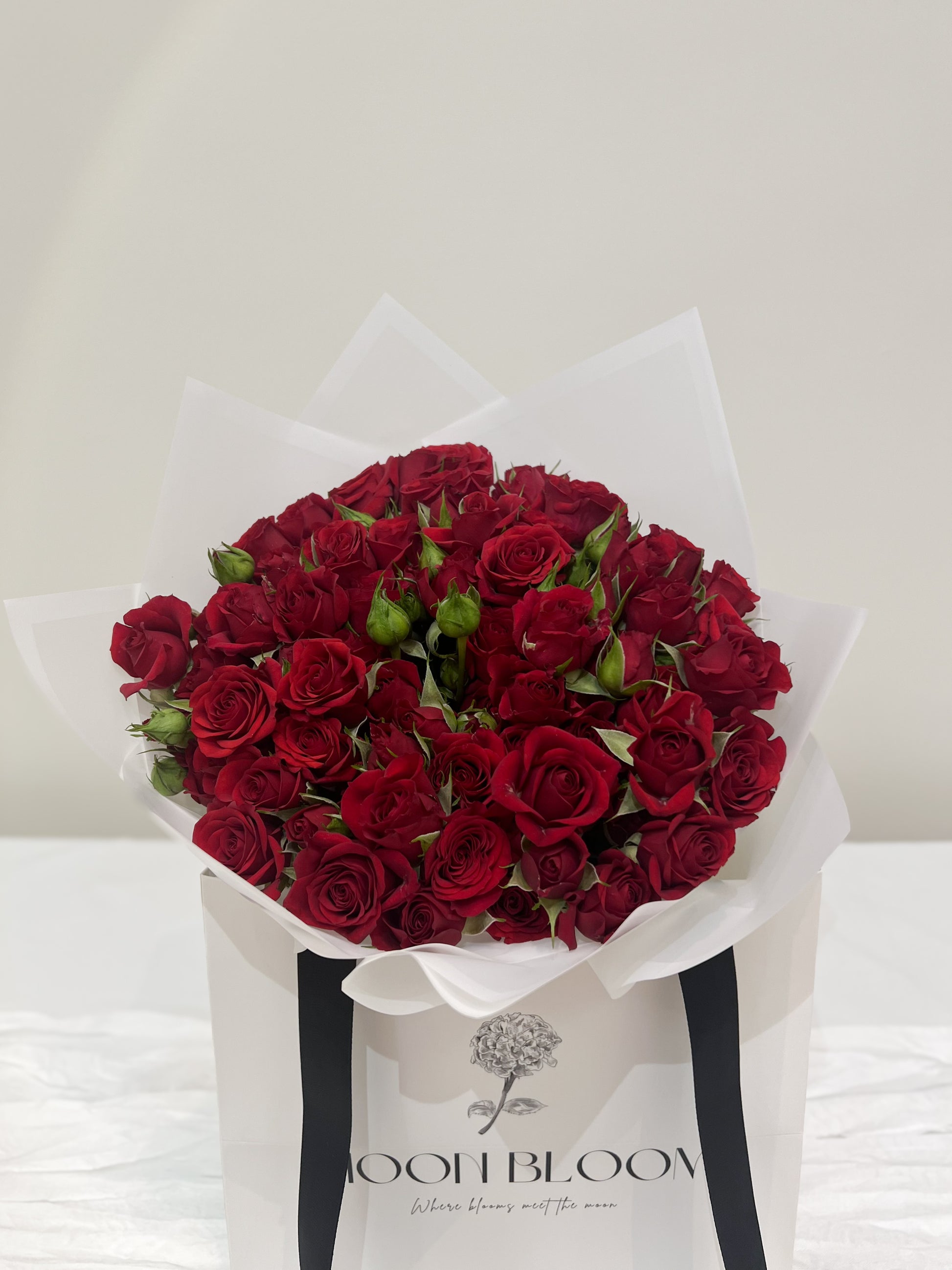 A captivating cluster of vibrant red spray roses, exuding charm and romance in every delicate bloom, bold yet graceful. Available in different sizes.
