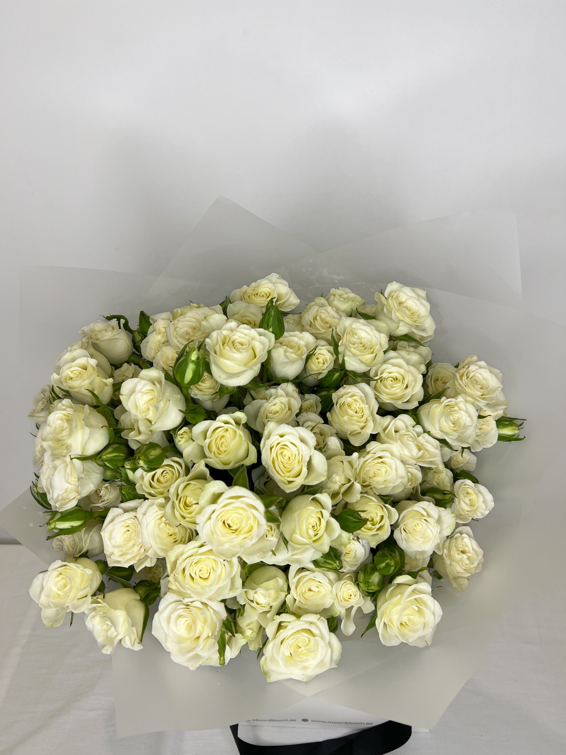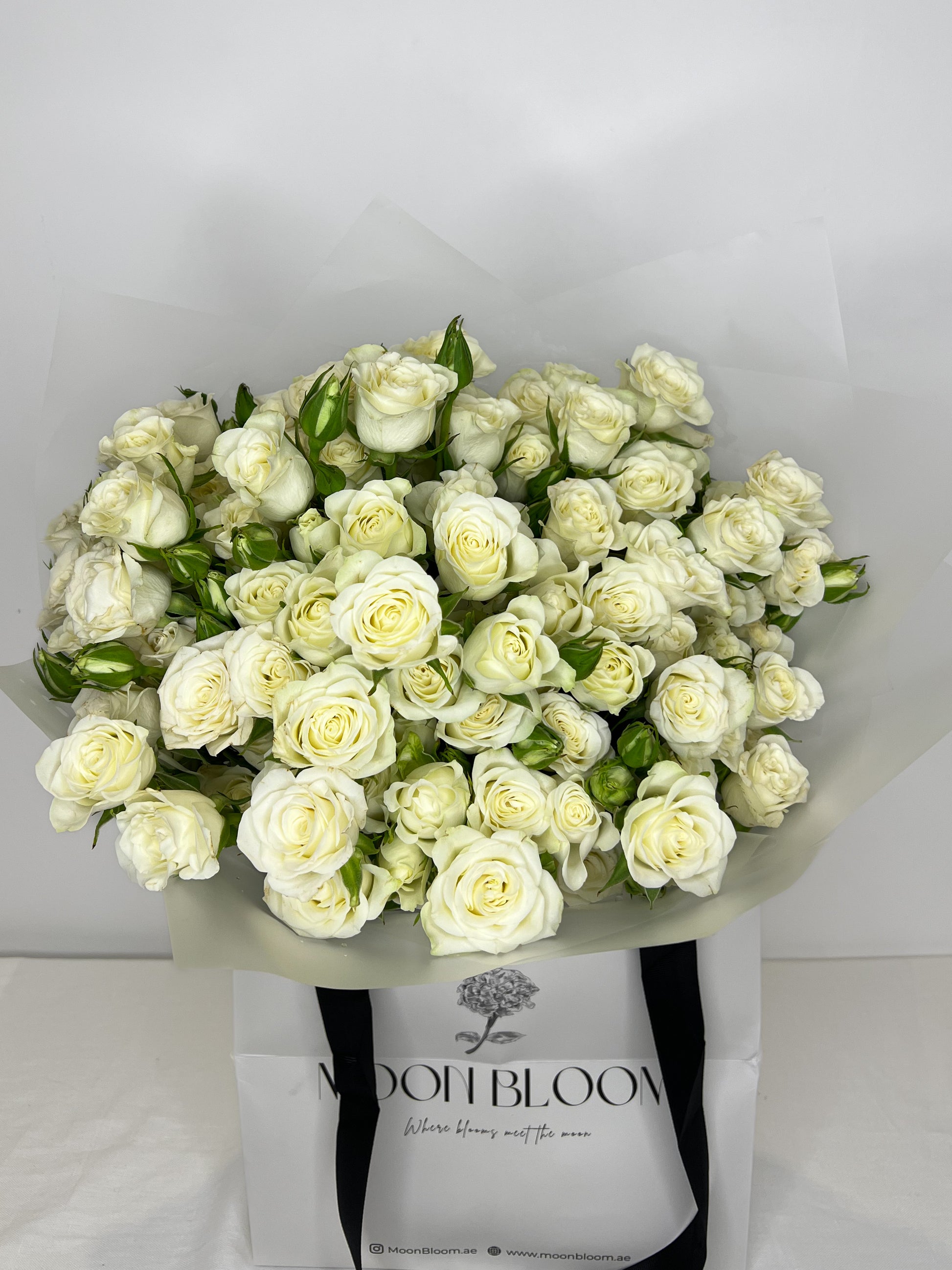 A delicate bouquet of pristine white spray roses, ethereal and elegant, perfect for moments of purity and grace. Available in different sizes.