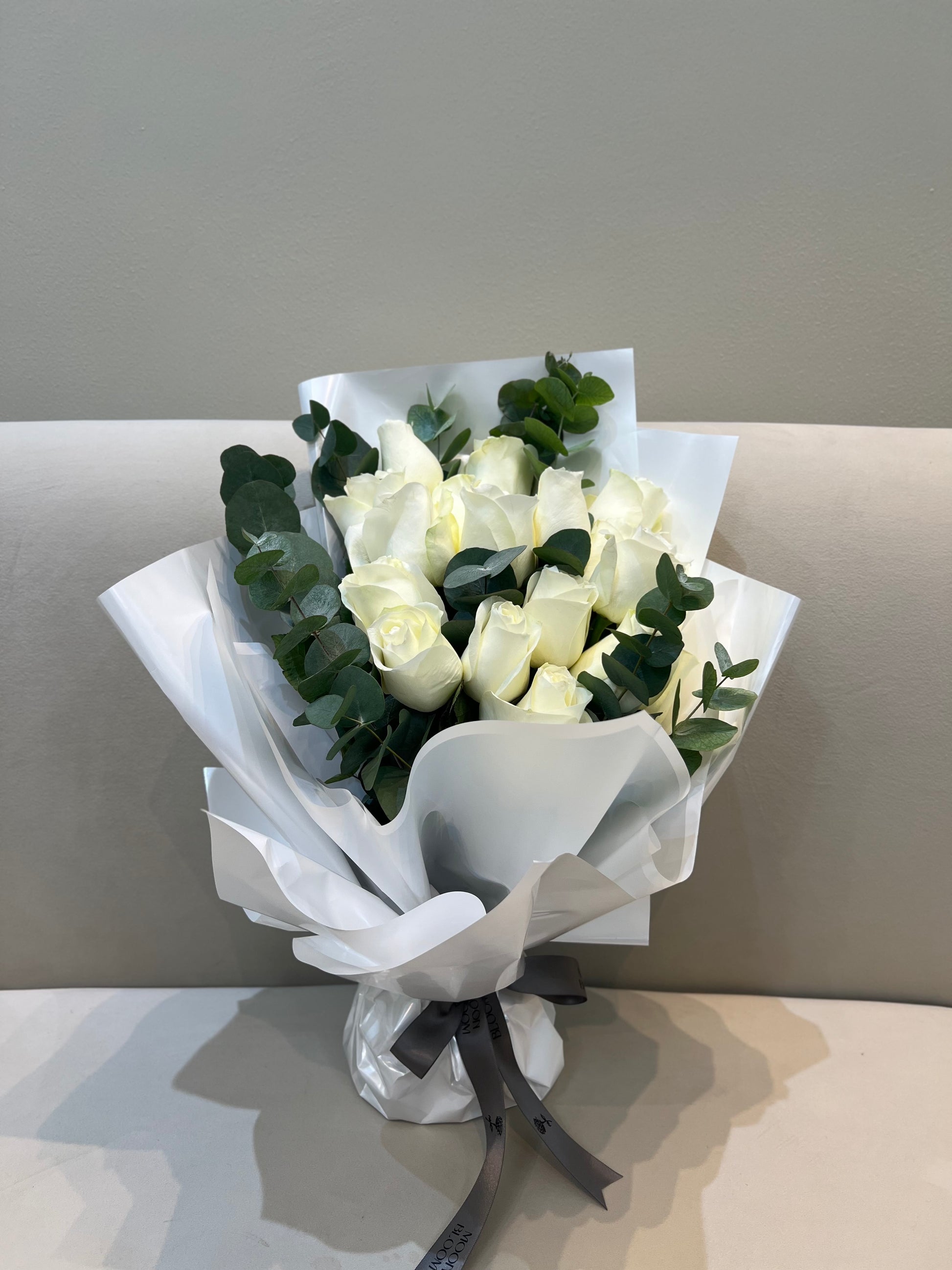 A passionate ensemble of white roses and eucalyptus, a timeless expression of love, soft snd simple. Available in different colors and sizes.