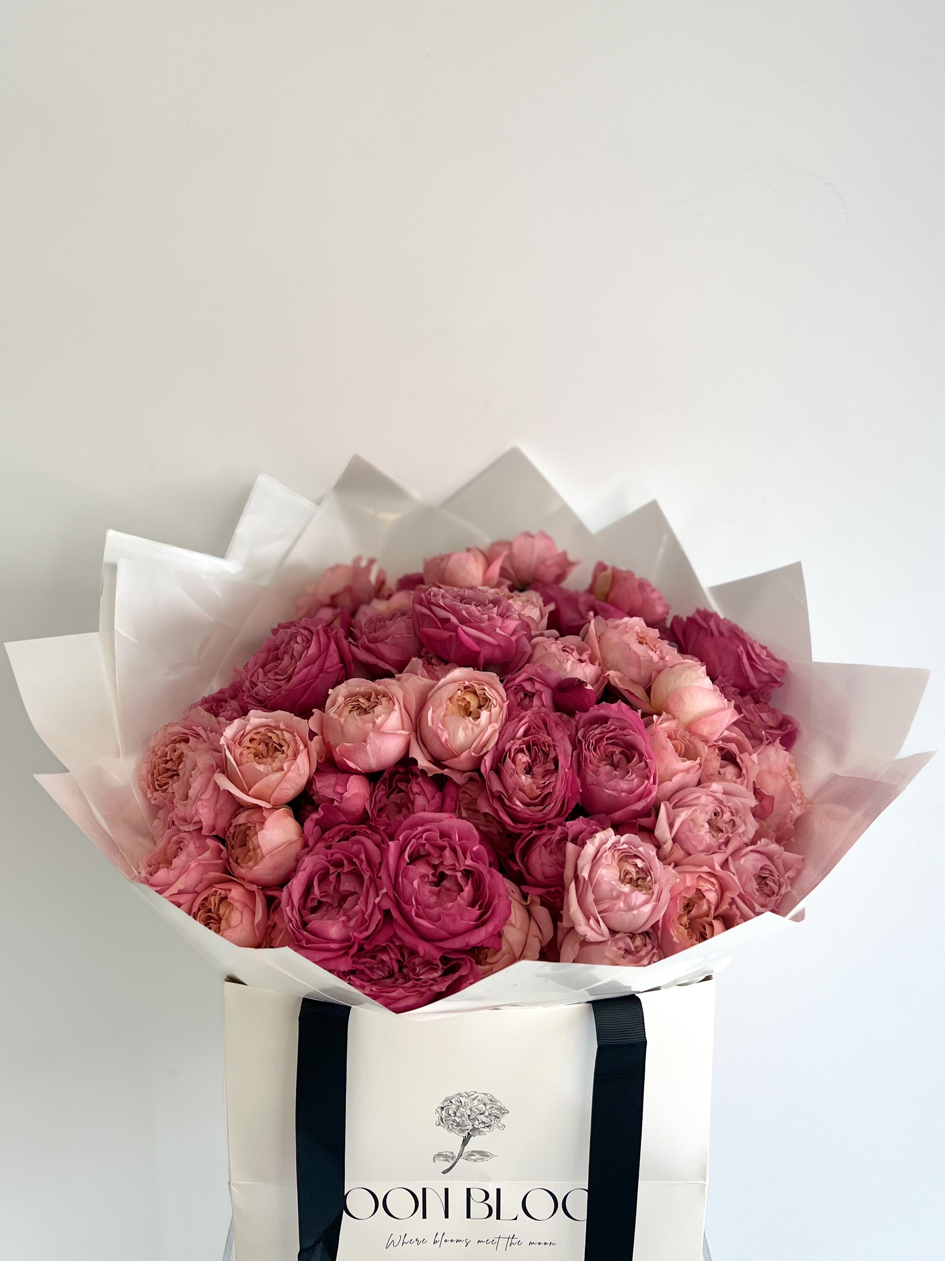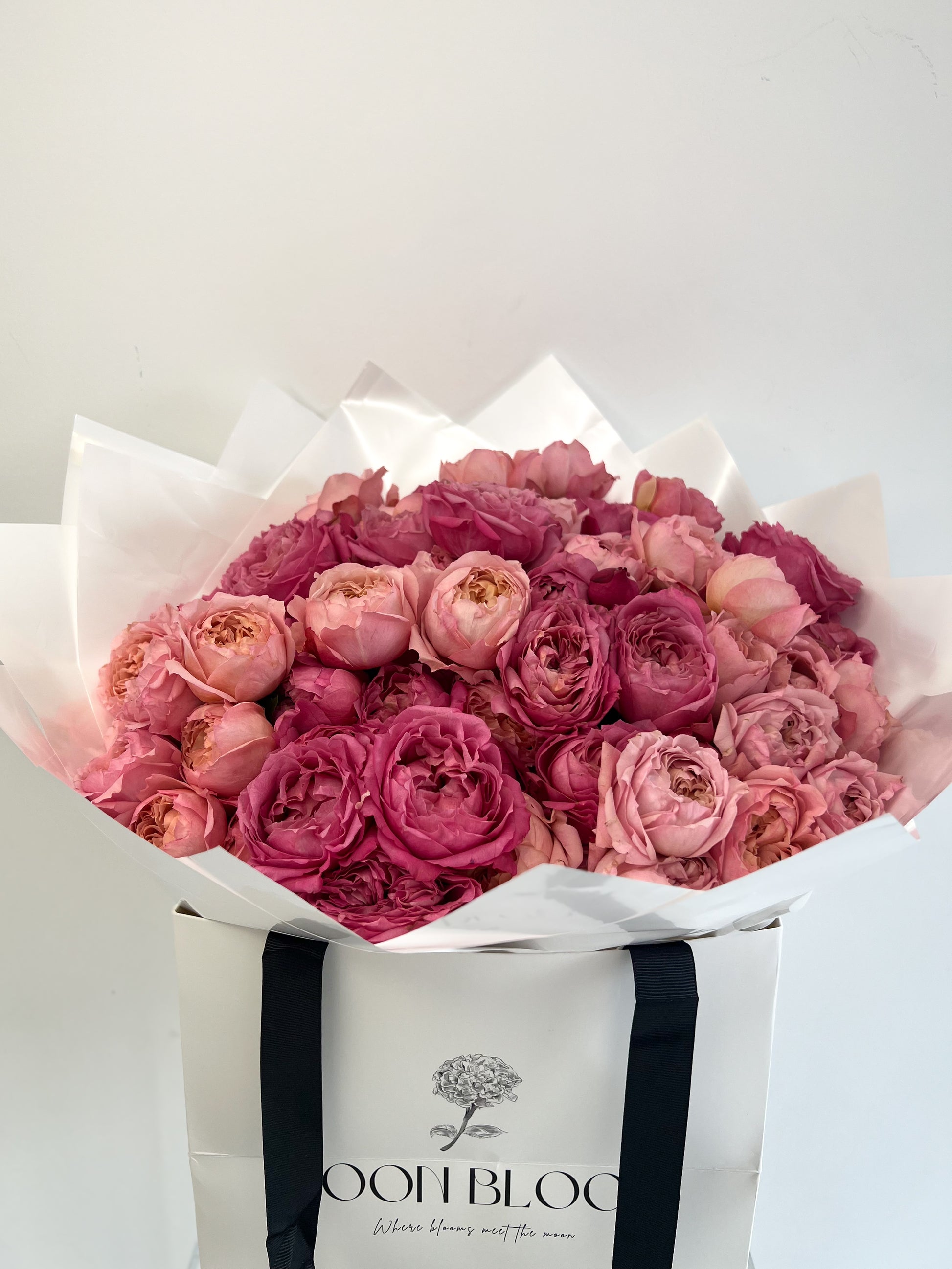 A graceful duet of light and deep pink Juliette blooms, twirling together like ballerinas.
