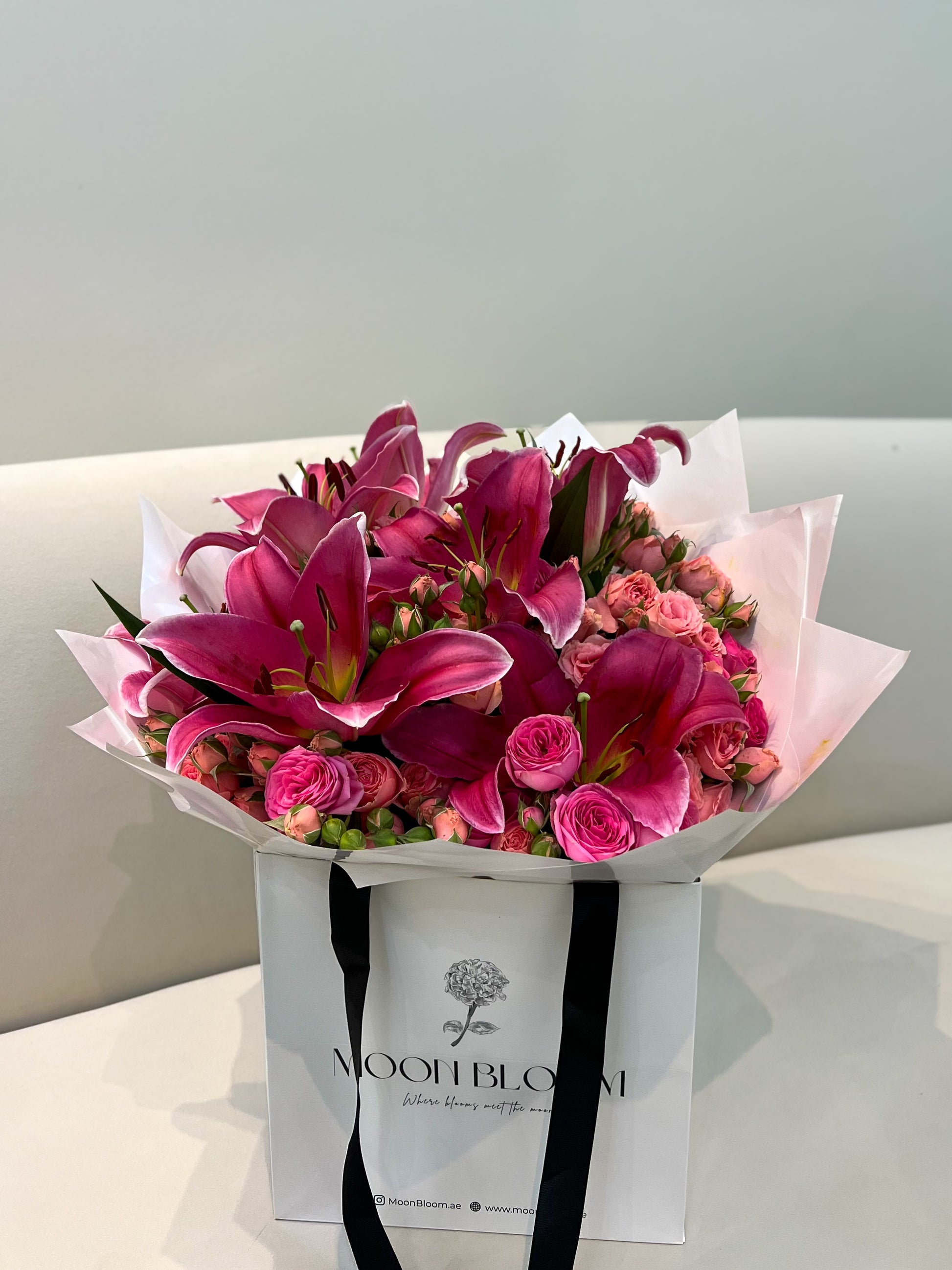 A tender harmony of lilies and spray roses blooming in pink, elegant and emotional.
